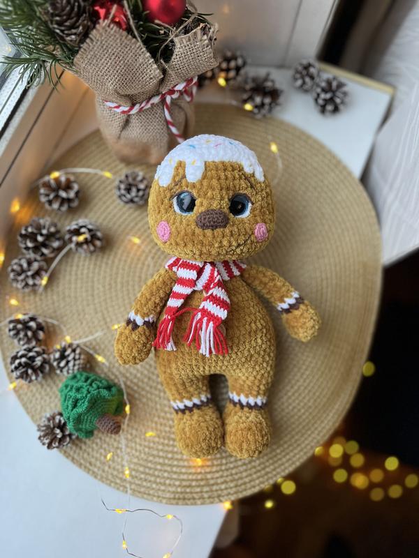 Мягкая плюшевая вязаная игрушка пряник Выполнена из гипоаллергенной пряжи Глаза надежно закреплены Шарфик снимается Елка не идет в комплекте