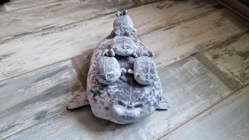 Игрушка подушка тюлень с детками. В комплекте тюлень мама и 4 ребенка тюленя. Размер мамы: 37х19см. Размер малышей: 9х6см. Снизу сбоку у мамы на животе молния и кармашек, куда можно прятать малышей. Материал игрушек мягкий как велюр. Игрушки новые.
