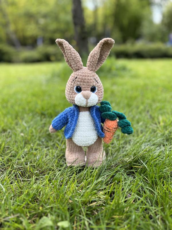 Плюшевый вязаный кролик Самостоятельно не стоит Кофточка снимается Морквинка в подарунок Высота кролика 32 см (в т.ч. ушки 5 см)