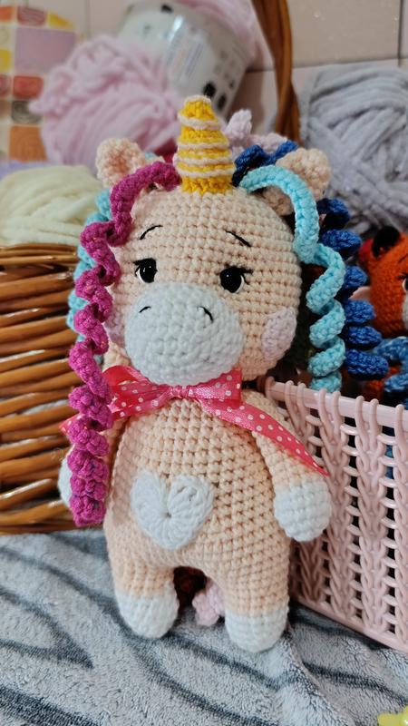 Маленькая единорожка, выполненная в технике амигуруми, создана из мягкой пряжи пастельных тонов. Ее особенности – кудрявая радужная грива, золотистый рог, сердечко на животике и очаровательный бантик в горошек. Игрушка удобно лежит в детских ручках и станет лучшим другом для малыша! Высота - 20 см. Пряжа - 50% акрил, 50% бавовна. Наповнювач - холлофайбер. Срок исполнения 2-3 дня.