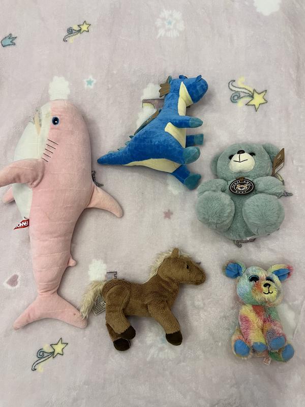 игрушки мягкие разные - акула, мишка, лошадка, собачка динозаврик. Все как новые - мишка и динозавр а с этикеткой. 1 шт 200 грн, лошадь и песик по 150 грн