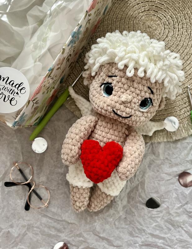 Игрушка вязаная крючком Янголятко с сердцем Купидон Размер +-25см, в подарочной упаковке ( упаковка бесплатно) В наличии и под заказ (2-3 дня) Самовозвиватель или отправка
