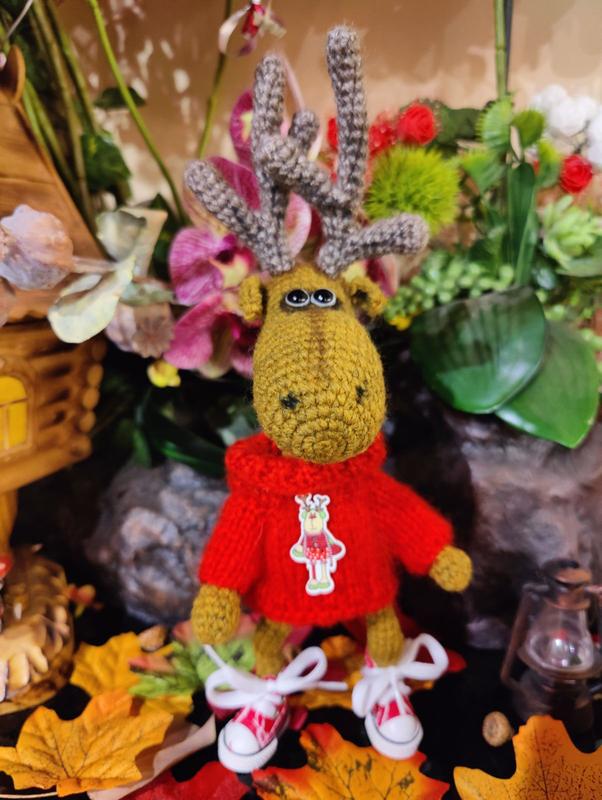 Вязаный лосик в наличии. Высота вместе с рогами около 25 см. В руках и ногах проволочный каркас.