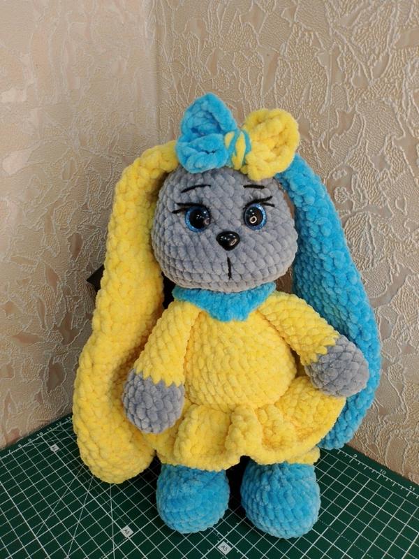 Зайка девочка с длинными ушами. Глаза и носик на безопасном креплении. Наполнитель - холлофайбер. Вязаная с любовью и нежностью к каждой петельке. Высота игрушки 28 см. Смотрите другие Мои объёмы.