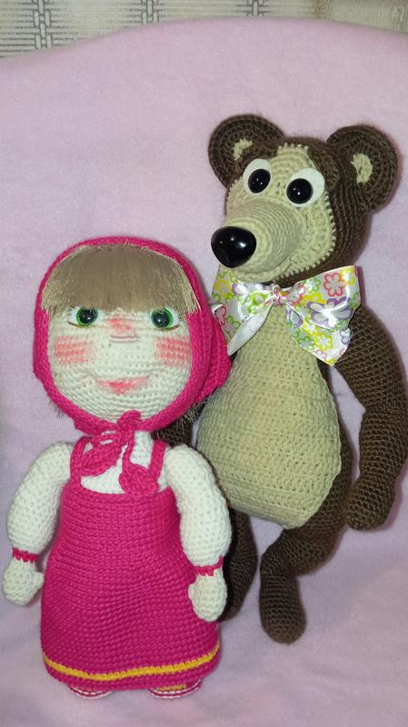 Персонажи мультфильмах "Маша и медведь". Вызовут положительные эмоции. Высота Маши- 30 см. Высота Мишки- 33-35 см. В Маше сарафан и платок снимаются. Можно делать прически. Девочки оценят.