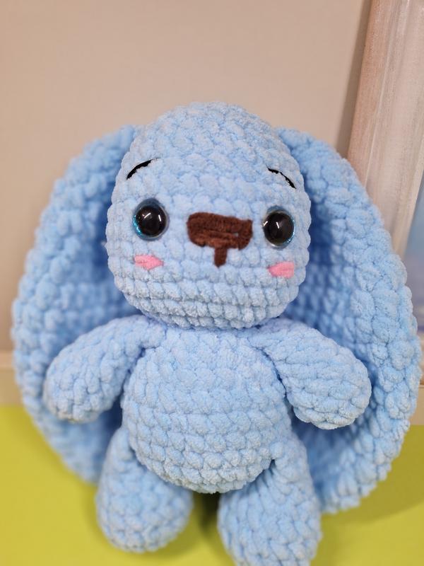 Зайчонок, изготовленный из мягкой плюшевой пряжи. Имеет длинные уши. Мягкий и приятный на ощупь. Наполнитель - холлофайбер, глаза - на безопасном креплении. Высота игрушки -25 см, длина ушей - 24 см. Возможно исполнение на заказ в любом количестве и цвете по желанию.