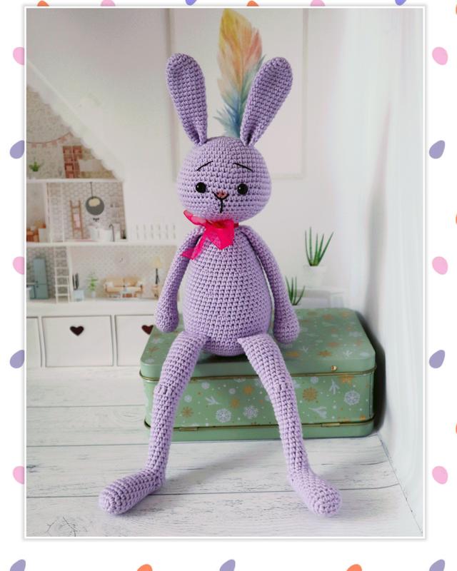 Зайчик связан из хлопковой пряжи, наполнитель - холлофайбер. В высоту с ушками и ножками - 35 см.