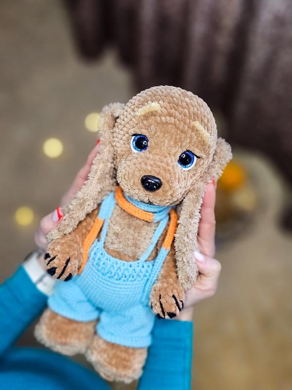 Продається чарівна спаніелька. Виконана із плюшевої пряжі. Одяг знімається. Висота іграшки - 31-33 см