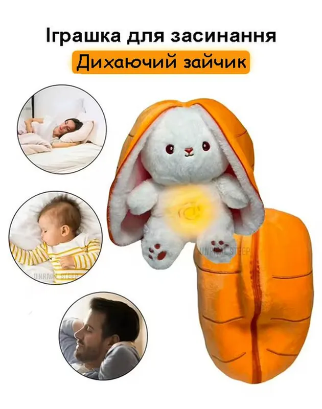 Дышащий зайчик в виде оранжевой морковки (как дышащая выдра) Плюшевая мягкая игрушка для сна "Дышащий заяц" – уютный друг для спокойного засыпания! Этот интерактивный плюшевый заяц создан специально для комфортного сна вашего ребенка или второй половинки. Его мягкий и приятный на ощупь материал обеспечивает уют и спокойствие, а функция дыхания имитирует естественные движения, которые помогают малышу или девушке расслабиться. Уникальная подсветка создает теплый ночной свет, что успокаивает и создает атмосферу сказочных снов. Благодаря встроенному музыкальному модулю заяц воспроизводит колыбельные мелодии, которые способствуют быстрому засыпанию. Компактный размер (30 см) и легкость делают его идеальным для объятий. Яркий оранжевый цвет добавляет радости в детскую комнату. ОСОБЛИВОСТІ: - Интерактивность: Имитация дыхания помогает ребенку почувствовать комфорт и безопасность; - 4 режима работы: * мелодия, ночник, звуки дыхания и движение животика; * ночник, звуки дыхания и движения животика (без мелодий); * звуки дыхания и движения животика (без мелодий и ночника); * ночник и движение животика; * выключен. - Подсветка: Мягкий свет служит ночником и добавляет уюта; - Мелодии: Встроенные мелодии помогают легко уснуть; - Выключается через 6 минут: Вы можете спокойно засыпать вместе с малышом, не переживая, что игрушка останется включенной на целую ночь и разрядится батарейки. Через 6 минут по окончании 10 мелодий она выключится самостоятельно. - Мягкий материал: Гипоаллергенный плюш, невероятно приятный на ощупь и безопасный для детей; - Компактный размер: удобный для объятий и путешествий; - Универсальность: Подходит для детей и девушек любого возраста. Тип элементов питания: 3хААА (батарейки в комплекте). Эта игрушка станет незаменимым помощником для родителей и лучшим другом Вашего ребенка или девушки, подарит спокойные ночи и счастливые ранки! Комплектация: Плюшевая игрушка в виде оранжевой морковки 3 батарейки ААА Важно! -Измена режимов происходит через кнопку на правой лапке (ножка). Правая сторона, если зайчик лицом к Вам расположен. -Сзади есть отверстие для отсека с батарейками, который прикрыт липучкой. -Игрушка самостоятельно выключается через 6 мин., поэтому можно не переживать, что если заснете с включенной игрушкой то батарейки за ночь разрядятся. Характеристики: Вид: Музыкальные детские плюшевые игрушки Персонаж: Заяц / Морковь Цвет: Оранжевый / Белый Вес: 450 г Размер игрушки: 30 х 22 х 16 см Возрастной диапазон: от 0 месяцев и для взрослых Пол: унисекс Питание: 3 батарейки ААА (в комплекте)