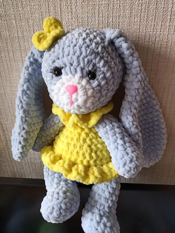 Мила плюшева зайка в яскравій сукні сумує без подружки. Створена, щоб дарувати любов, тепло і ніжність. Стане чудовим подарунком до будь-якого свята та на будь-який вік. Зріст 31см без вушок, з вушками -48см. Оченята і носик на безпечному кріпленні.