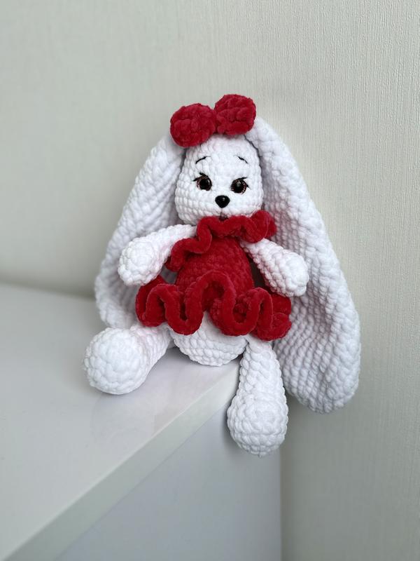 Эта милая вязаная крольчиха станет отличным дополнением к вашей коллекции игрушек или прекрасным подарком для ребенка. Она изготовлена вручную из мягкой, приятной на ощупь пряжи, что обеспечивает ей нежность и уют. Крольчиха имеет длинные ушки, выразительные глаза и милую мордочку, что делает ее особенно очаровательной. Она одета в красивую суккенку и имеет маленькие аксессуары, которые добавляют образу уникальности. Игрушка легкая, безопасная для детей, не содержит мелких деталей, поэтому подходит даже для малышей. Эта вязаная крольчиха принесет радость и тепло в любой дом!