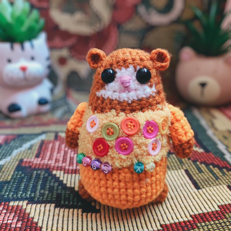 Плетеная крючком игрушка. Весенний слегка навеженный хомяк) Из акриловых нитей. Глаза, пуговицы, бусины -пластмассовые. Глаза приклеены. Наповнений холлофайбером. Намистинками выложены слова: hugs (объятия), 76 (целуя-обнимает). На рост 10 см.