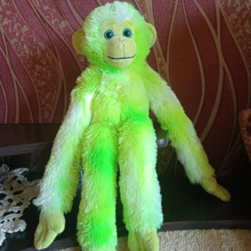 яркая обезьянка.обниматься.меет липучки на ручках.фото не передает яркость игрушки.очень насыщенный цвет.мягочка.