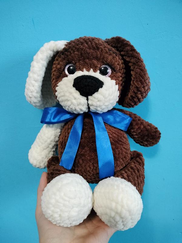 Собачка ручной работы, высота около 30 см. Наполнитель - холлофайбер, материалы не вызывают аллергии, очки на безопасном креплении. М| ягенький песик будет красивым подарочком и для деток, и для взрослых, как декор для комнаты. Открытка вкрпоштой и новой почтой.