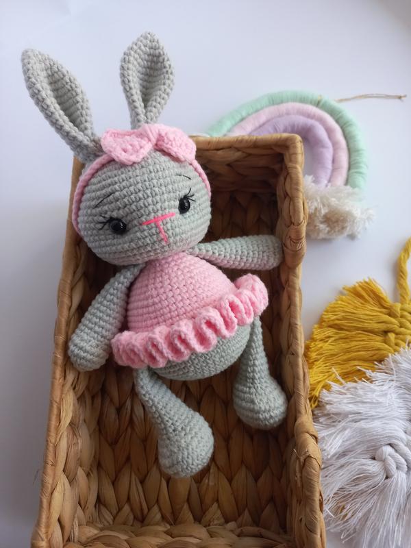 Вязаная зайка ручной работы Милая, нежная и безопасная для малышей с первых дней жизни. Эта зайка создана с любовью, из качественной гипоаллергенной пряжи, наполнена холлофайбером. Идеально подходит в качестве подарка на крестины, день рождения или как первая любимая игрушка. Размер: ~20 см Материалы: 55% хлопок/45% акрил, холлофайбер Уход: ручная стирка при температуре до 30°C