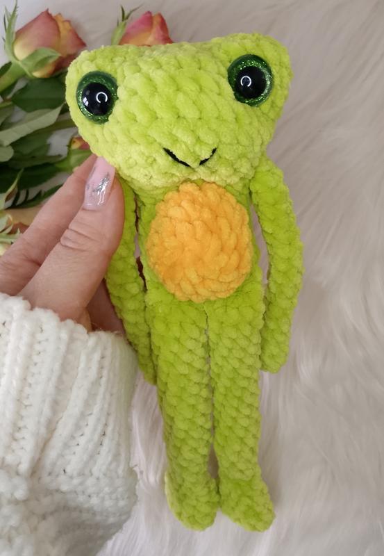 Лягушка ручной работы Высота игрушки 24 см Изготовлена из плюшевой пряжи Безопасные глаза Наполнение холлофайбер