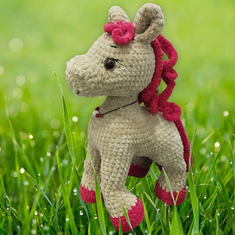 Игрушка связана крючком из велюровой пряжи, наполнитель халофайбер, глаза на безопасном креплении. Имеет пластиковые украшения, слегка приклеенный хвостик (что бы не вылезли концы пряжи). Игрушка мягкая и приятная на ощупь. Станет хорошим подарком деткам, а также взрослым которые родились в год лошади, также подарок в качестве символа 2026 года. Размер: высота 34см, длина 23см, ширина 14см.