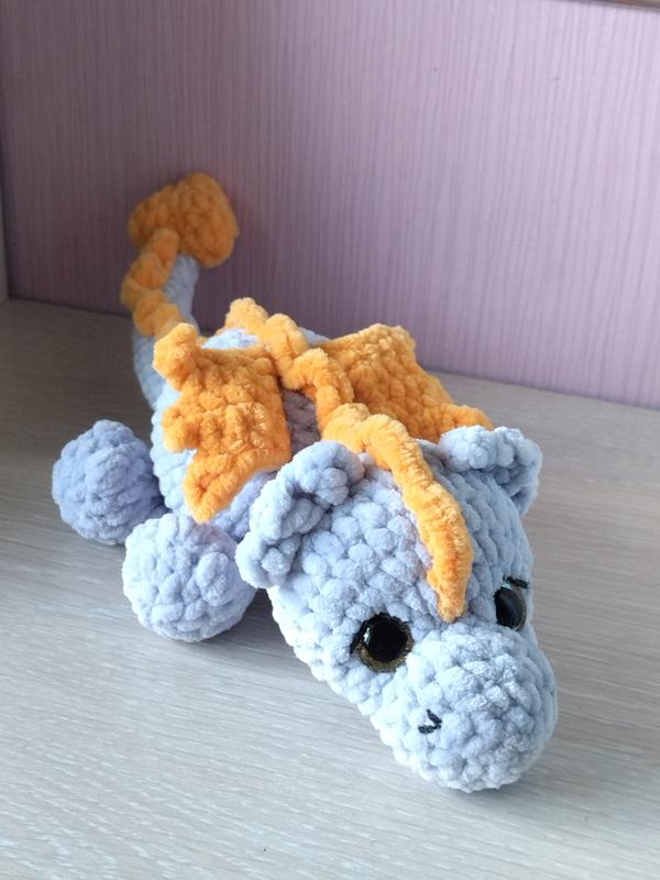 Дракон из плюшевой пряжи, с блестящими золотистыми глазами на безопасном креплении. Станет отличным подарком ребенку. Игрушка очень приятная на ощупь, нежная и мягкая. С дракончиком приятно играть, может быть игрушкой для сна, его удобно взять с собой на прогулку. Размер дракончика 32 см от носика до хвостика. Приобрести можно в Киеве лично или возможна отправка по любой почте после оплаты на карту.