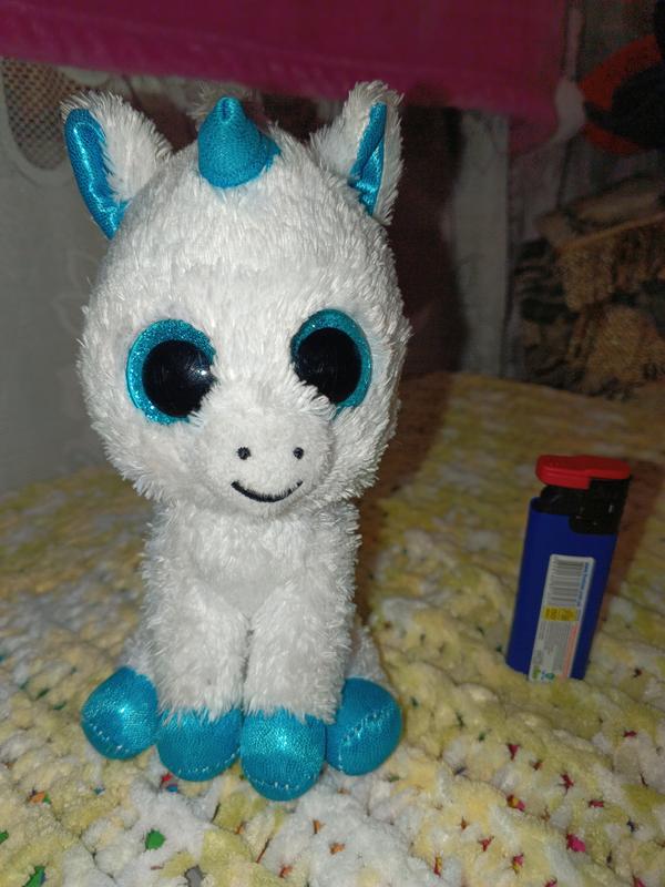Белый единорог с голубым рогом и копытцами, очень милый и опрятный. Длина - 17 см. В отличном состоянии, без пятен и повреждений. Идеальный вариант для подарка или коллекции.