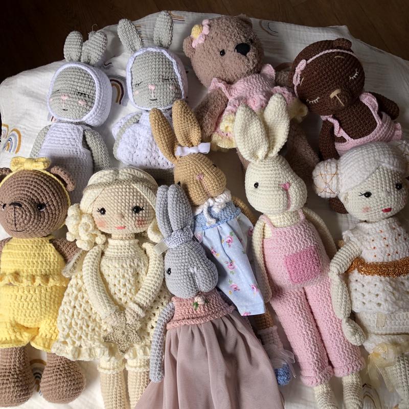Великий вибір вʼязаних іграшок. Якщо щось цікавить пишіть із задоволенням відповім на всі запитання)) Кролики по 790 Зайчики близнята 799 за пару Ведмедики 750, той що посередині 515 Янгол 880 Фея 820