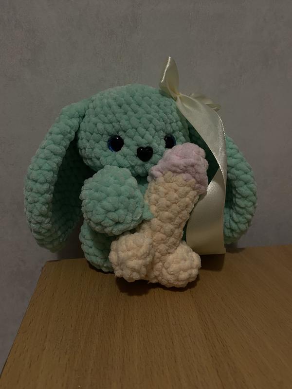 Мʼягка іграшка, зайчик із блискучими оченятами