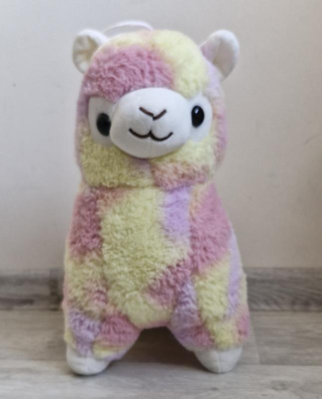 плюшевая игрушка в виде альпаки или ламы. Она обладает мягкой, пушистой текстурой и окрашена в пастельные оттенки розового и желтого цветов.