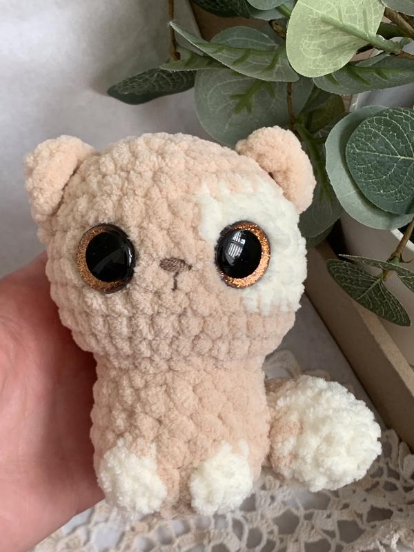 Вʼязаний котик з плюшевої пряжі . Котик саме для тих хто любить гуляти чи ходити в садочок з улюбленою іграшкою. Зріст 10 см . Не займає багато місця , можна покласти в рюкзачок . А ці оченята мало кого залишають байдужими 😉)