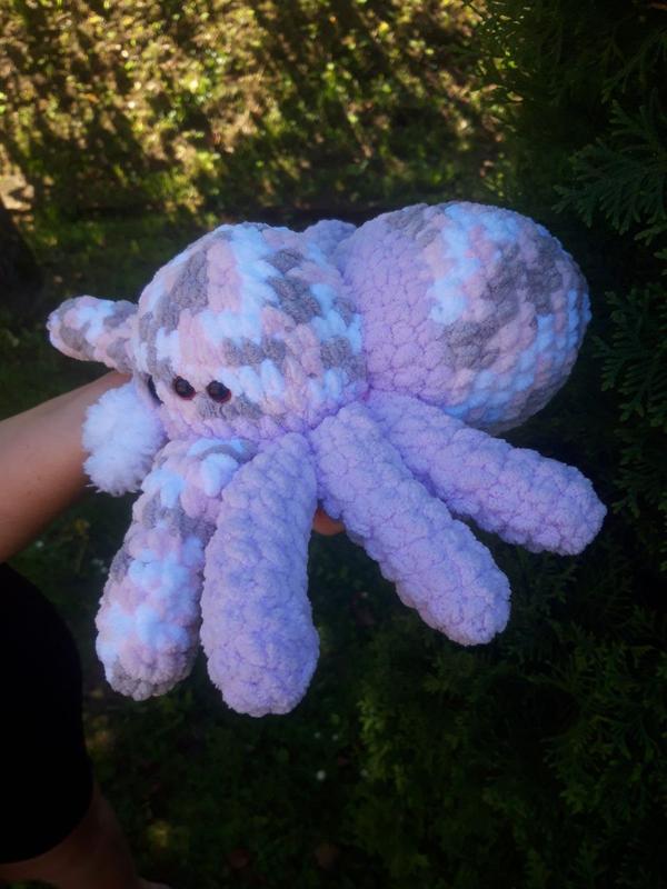 Паучок связан из нежной плюшевой пряжи, приятной на ощупь, размером 25×29 см. Имеет большие выразительные глазки на безопасном креплении, так что подходит даже для деток. Мягкий, яркий и совсем не страшен – станет отличным другом и оригинальным украшением интерьера.