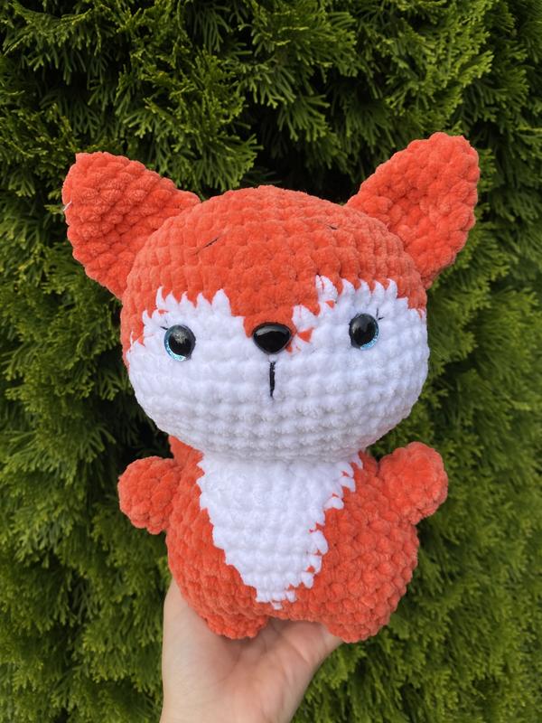 Вʼязана лисичка “hand made” помаранчево-червоного кольору з білою грудкою і кінчиком хвостика Звʼязана з плюшевої пряжі ”himalaya dolphin baby” Висота-25см ширина-16см