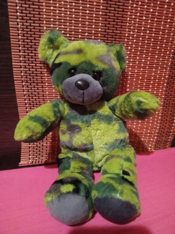мишка в камуфляже.стан нового.позада закрыт на липучку.имеется мешочек и стирается.в сидячем положении 19 см.с ножками 30см.