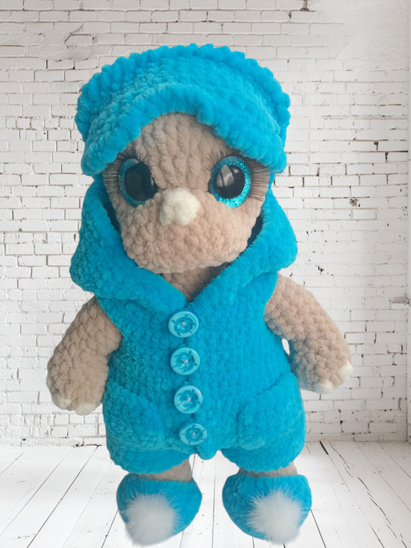 Игрушка изготовлена из плюшевой пряжи, наполнение-холофайбер. Глаза на безопасном креплении. Комбинезон снимается, в комплект также входит маска и тапульки украшены помпонами. Возможно исполнение в других цветах. Рост ~ 24 см