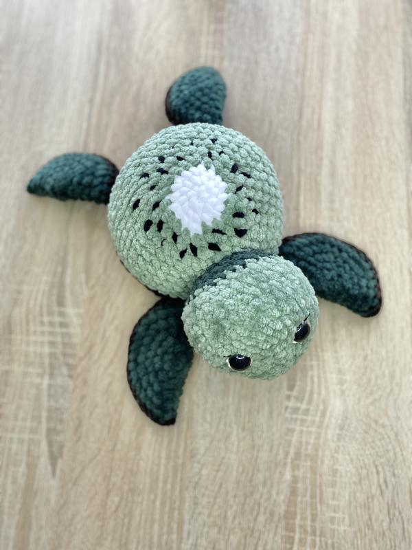 Черепашка-ківі 🐢🥝 ✨Довжина: 21 см (голова+панцир) ✨Діаметр (від ласти до ласти): 34 см ✨Оченята з безпечним кріпленням. ✨Плюшева пряжа.