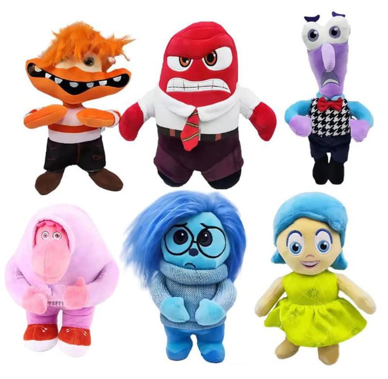 Набор из шести мягких игрушек из мультфильма Головоломка. 1. Тревожность - 23 см 2. Гнев - 21 см 3. Страх - 24 см 4. Стыд - 24 см 5. Печаль - 22 см 6. Радость - 23 см Материал: плюш Производство: Китай
