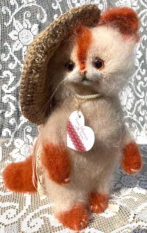 Котик вив язаний з м якесенького кід-мохеру, наповнювач синтепух, всередині проходить мідний дротяний каркас, дякуючи цьому всі частини тіла котика згинаються, іграшці можна надати будь-якого положення в просторі. Очі скляні. Капелюшок у комплекті з котиком. Висота котика біля 33 см. Котик не рекомендується для активних ігор та для ігор маленькими дітьми. Він має мілкі деталі та довгу натуральну шерсть. Іграшка буде запакована у подарункову прозору коробочку.