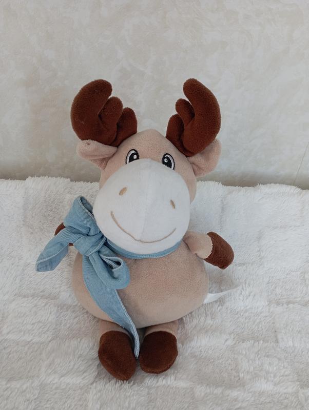 Мягкий олень в красивом состоянии,меет джинсовый шарф.Небольшое пятно от фломастера.