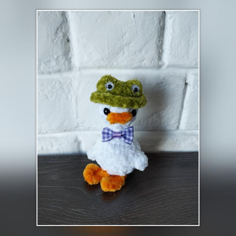 Маленькая игрушка в ладошку, гусячок, в шапочке лягушонок, из велюровой пряжи