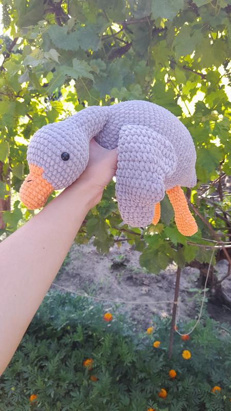Мягкая игрушка гусик. Мягкая на ощупь, сделана с гипоаллергенных материалов. Изготовлена с плюшевой пряжи. Наповнювач холлофайбер. Глаза на безопасном креплении. Размер игрушки 42 см.