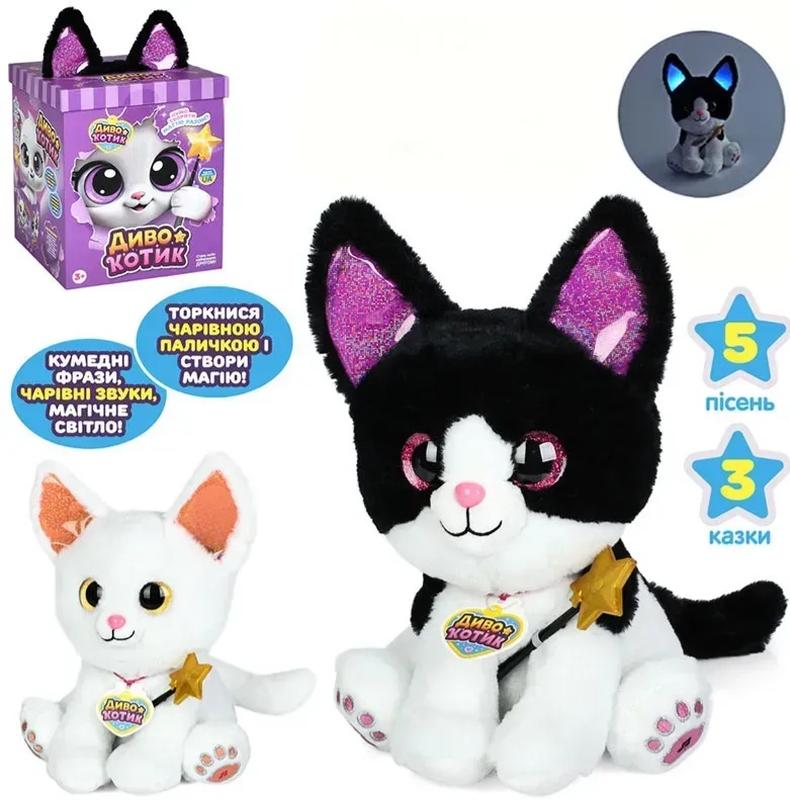 Очаровательная интерактивная игрушка - плюшевый котик с очаровательной палочкой. В наличии черно-белые. Этот мягкий котик станет верным другом вашего ребенка, наполняя игру светом, музыкой и сказочными приключениями. Функции: - Реакция на волшебную палочку: стоит коснуться носика котика волшебной палочкой, как он сразу отреагирует, активируя свои функции. - Подвижность: котик двигается, придавая игре динамичность и реализм. - Повторяю фраз: игрушка умеет повторять произведённые фразы, превращая общение в веселое развлечение. - Звуковое сопровождение: Котик знает 5 песен и рассказывает 3 интересные сказки на украинском языке. - Он также озвучивает забавные фразы и воспроизводит волшебные звуки. - Световые эффекты: Игрушка имеет подсветку - светящиеся ушки создают сказочную атмосферу, особенно в темноте. Размеры игрушки: 27 - 20 - 18 см; Питание игрушки: 3 батарейки типа АА (не входят в комплект); Размеры упаковки: 26 - 17 - 17,5 см; Упаковка: коробка;