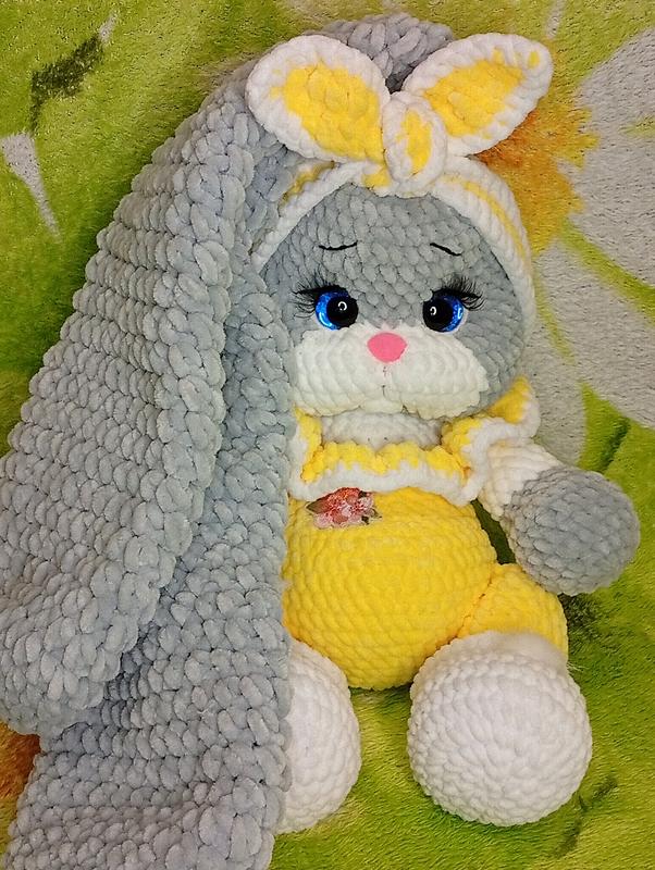 нежная яркая зайка с длинными ушками связана крючком. Рост игрушки 40 см. Очки на безопасном креплении. Наполнитель холлофайбер. Красивая и нежная игрушка