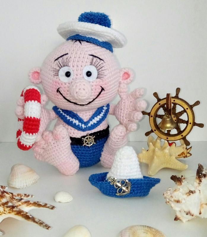 Морячок ручной работы, вязаный крючком, выполнен из пряжи YarnArt JEANS (55% Хлопок, 45% Полиакрил). Наполнитель – холлофайбер. В комплект входят две шапочки и спасательный круг. Вместе с Моряком подарите вашему ребенку яркие эмоции и радость!