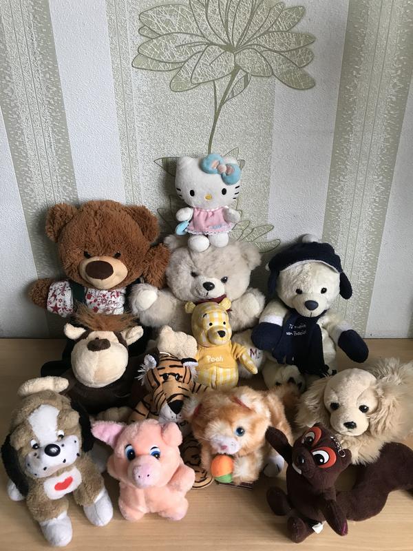 В наявності всі 12 шт як на фото Ціна 1 іграшки 79 грн окрім: КІШЕЧКА HELLO KITTY 90грн (довжина 16 см) МЕДВЕДИК В СИНЬОМУ ШАРФИКУ 90 грн, на спинці в нього схованка на блискавці, де можна ложити цукерки, монетки Іграшки наших дітей, не секонд Ми вже подорослішали При замовленні двох іграшок знижка