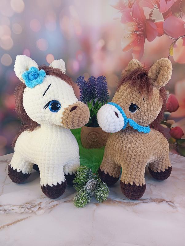 М'яка іграшка коник, ручна робота, зв'язана гачком з плюшевої гіпоалергенної пряжі, наповнювач холофайбер. Надійне кріплення деталей. Висота 22 см. Про наявний колір обов'язково запитуйте. Зараз в наявності тільки світло-коричневого кольору. Можливе виготовлення в інших кольорах протягом 2 днів.