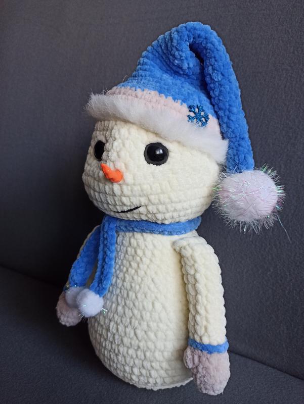 Вязаный снеговик, ручной работы, выполненный из гипоаллергенной плюшевой пряжи. Идеально подойдет в качестве декора под елку. Высота30-32см.