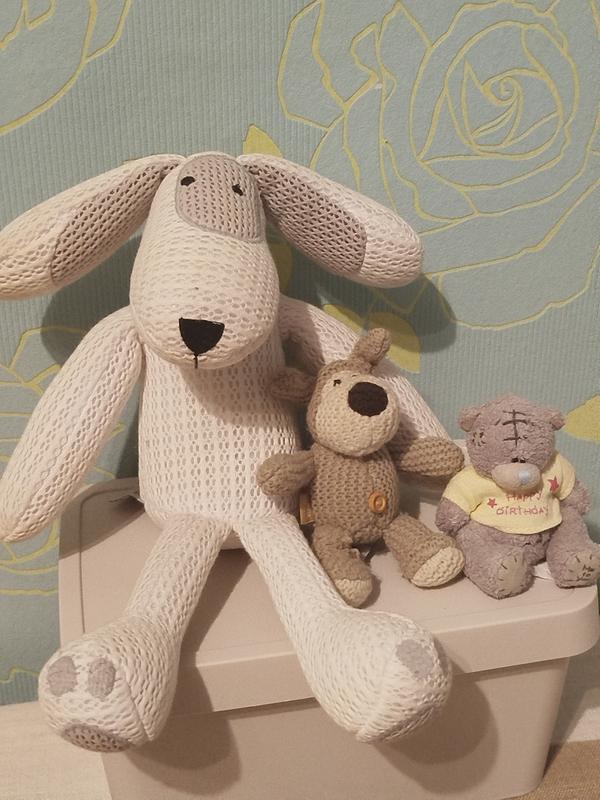 маленький мишка и собачка по 150 большая собачка 250, маленькая собачка - это брендовая Английская игрушка,новая но нуждается в ремонте,спущено несколько петель