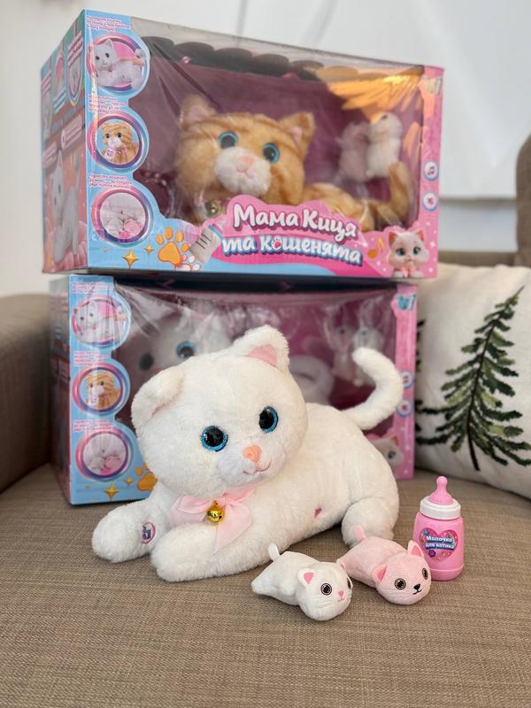 Іграшка ніби оживає: вона муркоче, співає пісеньки англійською, реагує на дотики та навіть «годує» малят. Варто лише піднести кошеня чи пляшечку — і пролунає звук пиття молочка. 2 кошеняти у комплекті; звук пиття молочка при піднесенні пляшечки чи кошенят; сенсорна зона на спинці (активує пісеньки, мелодії та звуки); функція запису та відтворення голосу; натискання на лапку вмикає милий «няв»; розмір мами-кішки: 25 см; у комплекті пляшечка для годування.