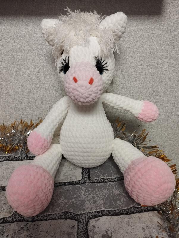 Зв'язана з плюшевої пряжі Грива та хвіст з напівбавовни Наповнювач холлофайбер Очі на безпечному кріпленні Висота з вухами 35см Довжина 16см Ширина 13см