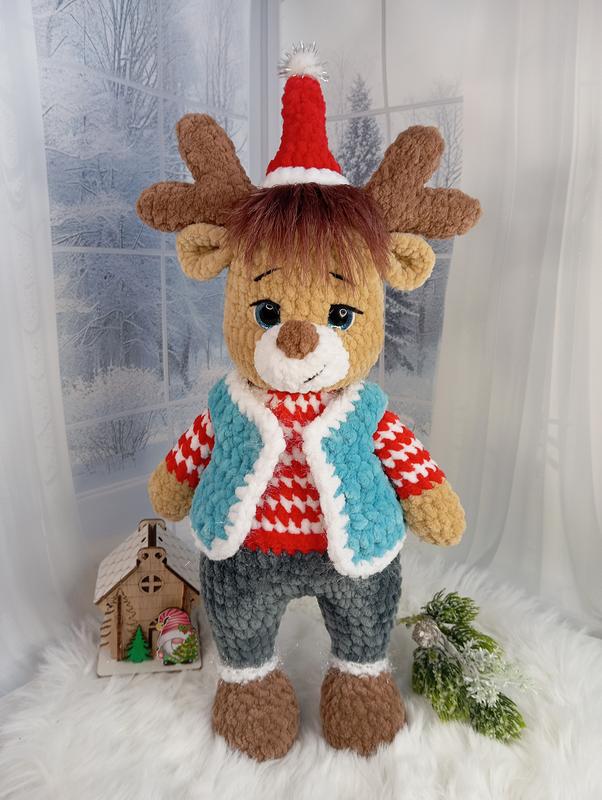 мягкая игрушка олень, ручная работа, связанная крючком из плюшевой гипоаллергенной пряжи, наполнитель холлофайбер, надежное крепление деталей. Высота до кончика рожек 34 см, жилет снимается. Стоит с опорой.