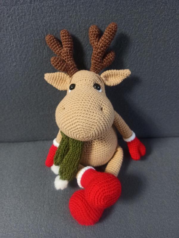 Олень Рудольф выполнен из гипоаллергенной пряжи. Милый и дружелюбный, идеально подойдет в качестве декора к новогодним праздникам, или в качестве подарка для ребенка. Высота 28-29см с рожками.