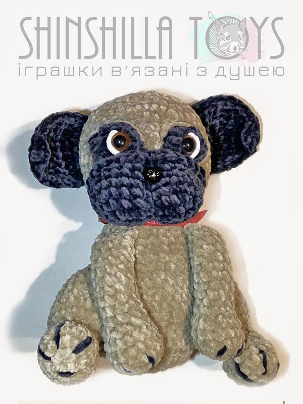 Вязаная игрушка песик породы мопс, выполненная из чрезвычайно нежной и приятной на ощупь плюшевой пряжи. Глазки с 3D-эффектом и носик на безопасных креплениях. Настоящий ошейник с платинкой придает игрушке дополнительный реализм) Высота игрушки (в сидячем состоянии) 27 см.