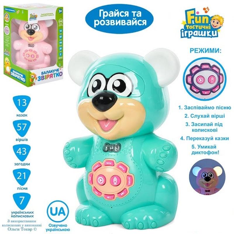 РОЗУМНИЙ ВЕДМЕДИК 2 кольри Українська озвучка Розумний ведмедик це справжній друг Вашого малюка! З ним завжди весело та цікаво! Він вміє співати пісні, розповідає вірші та казки. Керувати іграшкою дуже просто — на животику розташовані зручні кнопочки, що активують усі звукові функції. Додатково розумний Ведмедик має кілька сенсорів, що реагують на дотик — а це ще більше веселощів і радості під час гри! Музика програється в гарній HD якості Озвучення записане професійними акторами з чудовою якістю голосу та виразною інтонацією. Основні характеристики: 57 віршів 13 сказок 43 загадки 21 пісня 7 українських колискових Працює від батарейок АА 3шт. (Не додаються) Матеріал : Виробник : -